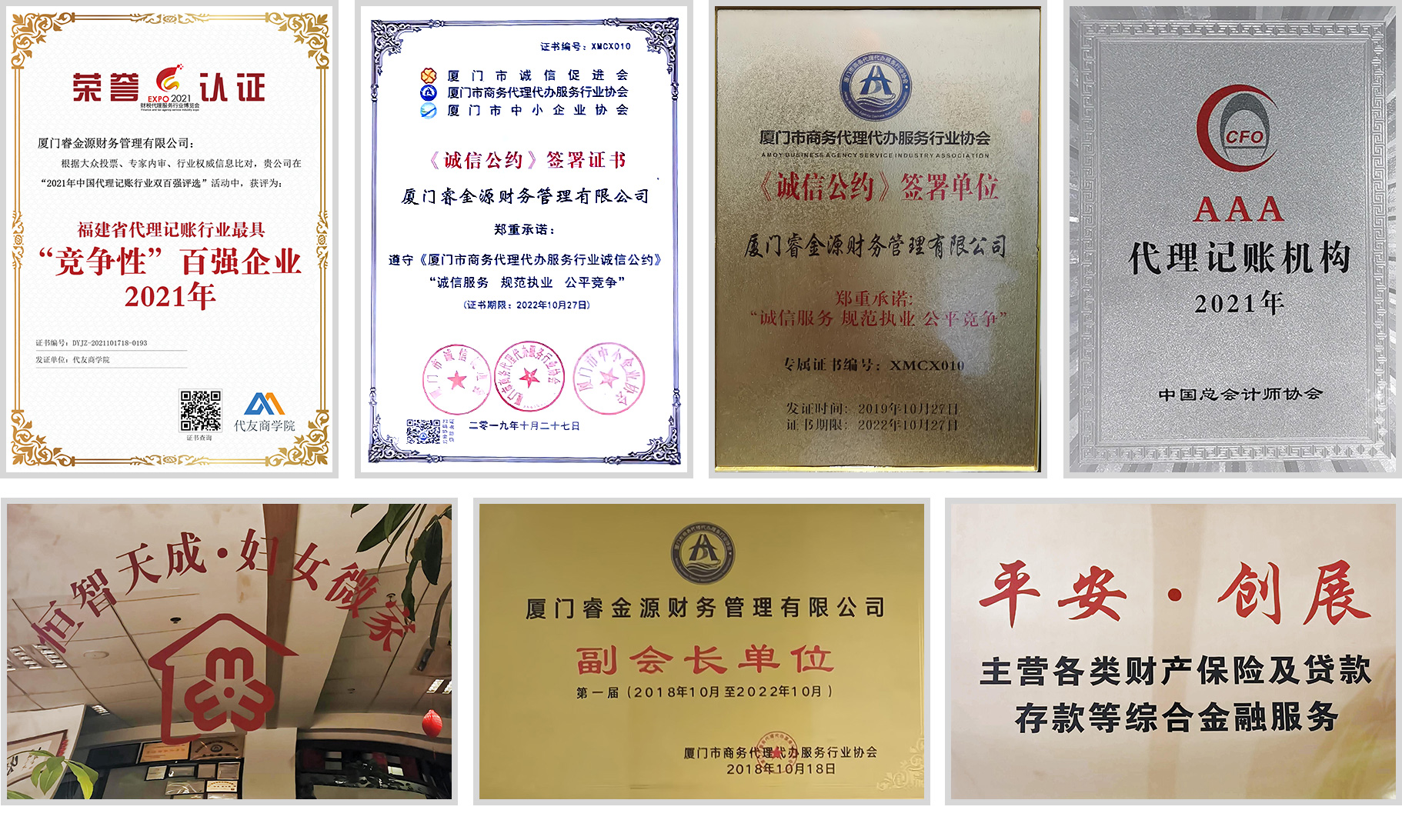 廈門睿金源財(cái)務(wù)管理有限公司是廈門商務(wù)代理代辦協(xié)會(huì)副會(huì)長單位,海集分會(huì)會(huì)長單位,廈門市商務(wù)代理代辦服務(wù)行協(xié)會(huì)《誠信公約》簽署單位,并獲得先進(jìn)基層黨組織等多種榮譽(yù)稱號。2021年被中國總會(huì)計(jì)師協(xié)會(huì)評定為3A級代理記賬機(jī)構(gòu),通過大眾投票獲得”福建省代理記賬行業(yè)最具競爭性百強(qiáng)企業(yè)”稱號。